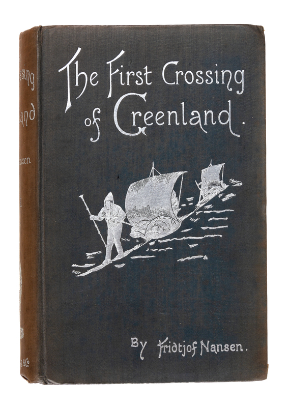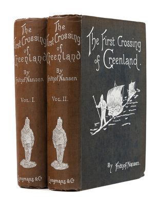 2 volumes, 8vo. With 5 folding route maps, 12 plates & numerous illustrations in text. Original publisher's pictorial blue-green cloth blocked in gilt and silver (spines and lower covers slightly darkened, otherwise fine). Provenance: Otto Orren Fisher (bookplate).FIRST ENGLISH EDITION of Nansen's expedition across the Greenland icecap in 1888-89. First published in Norway the same year. Arctic Bibliography 11985.
