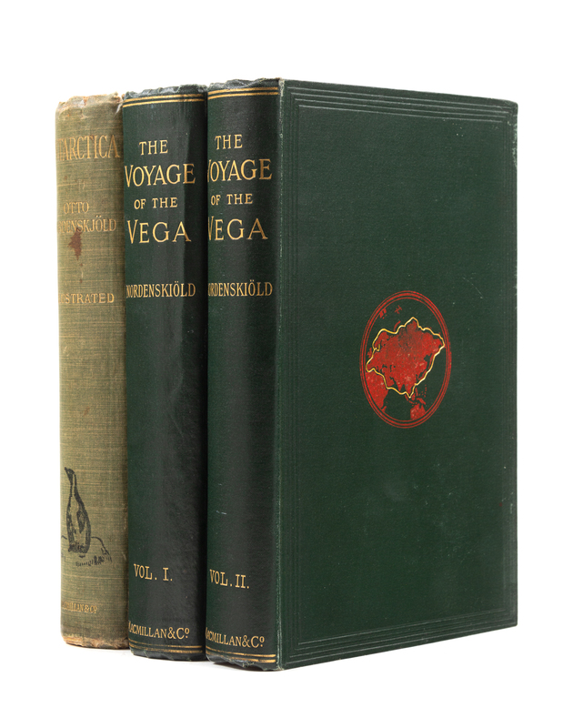 [With:]NORDENSKJOLD, and John Gunnar ANDERSSON (1874-1960). Antarctica; or Two Years Amongst the Ice of the South Pole. London and New York: Hurst and Blackett, Macmillan, 1905. 8vo. Frontispiece portrait, numerous maps, a proliferation of full-page and in-text half tones. Publisher's decorated light green cloth gilt (soiled and rubbed, repairs to spine ends). FIRST AMERICAN EDITION.
