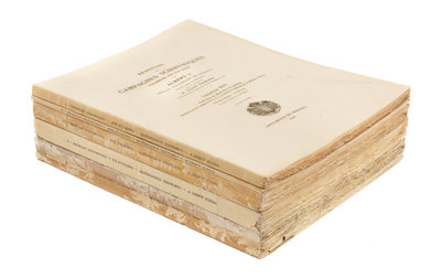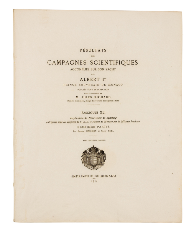 5 volumes, folio. With 3 folding maps and 88 photogravure plates after Isachsen and Hoel (many folding or panoramic). ORIGINAL PRINTED WRAPPERS AND GLASSINES (Vol. I chipping at edges and with repaired tear, otherwise fine); green cloth folding-case. FIRST EDITION, the complete report of the Norwegian Spitsbergen Expedition (1906-1907), which was sponsored by the Prince of Monaco and led by Isachsen. Arctic Bibliography 7796. RARE.