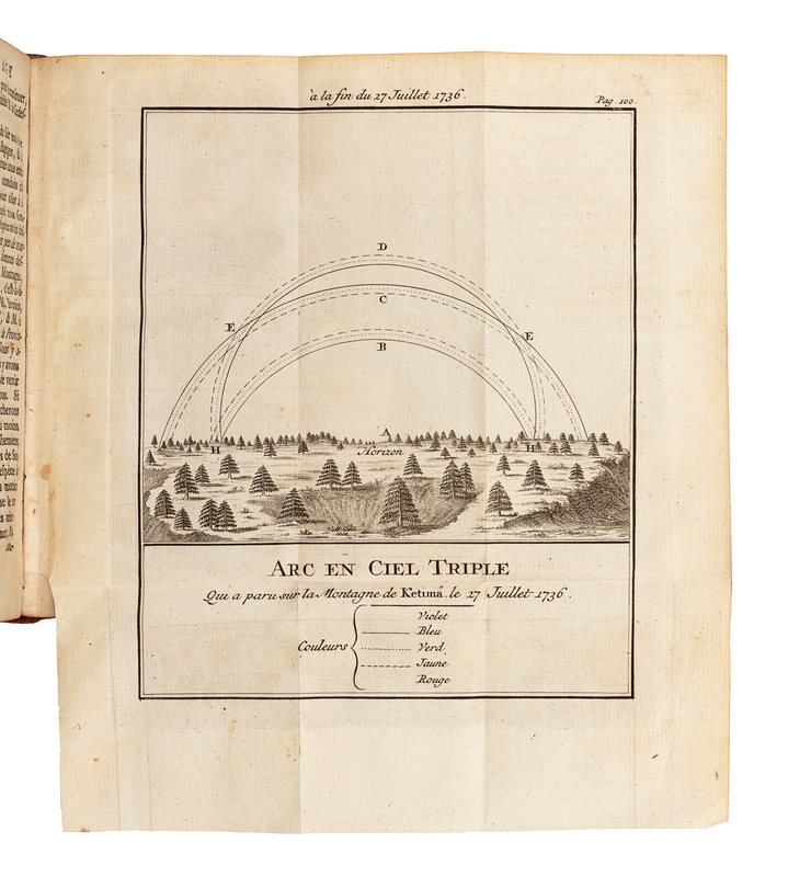 12mo (155 x 93 mm). With 5 engraved folding maps & plans and 11 engraved folding plates. Contemporary half calf. Provenance: Previous ownership stamp partiallly effaced on pastedown.First Octavo Edition. This Royal French Expedition was led by members of the French Academy of Sciences and was one of two to determine the dimensions and shape of the early by measuring one exact degree of meridian. Although the printed table lists 18 engravings, 2 were never printed. It was first published in Paris in quarto in 1744. Brunet IV, 262.