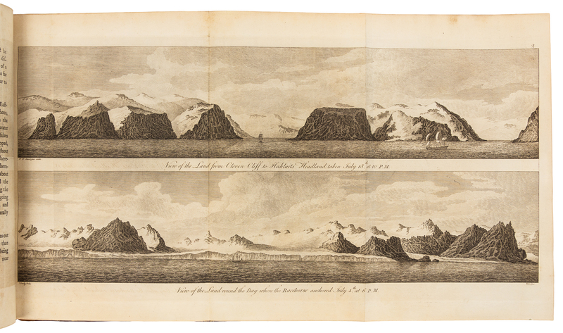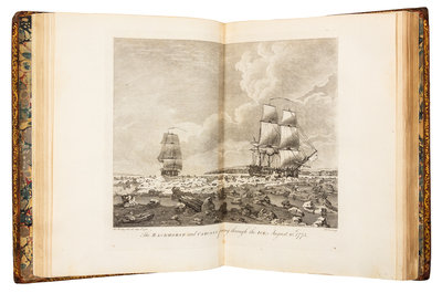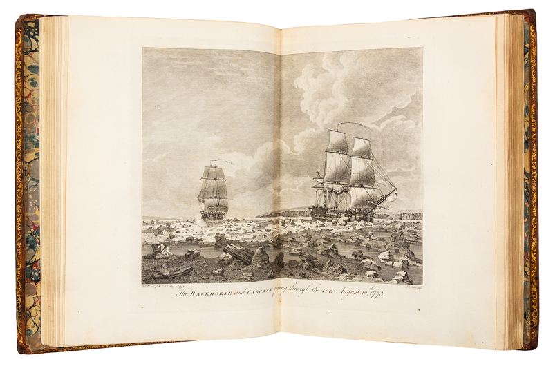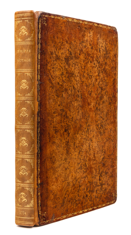4to (293 x 226 mm). 15 engraved plates (11 folding, 4 double-page). (Offsetting from some plates.) Contemporary tree calf, covers with Greek key roll border gilt (rebacked to match, covers worn). FIRST EDITION, an "important addition to early nautical science in the polar regions... The voyage is perhaps better remembered for the presence of a young Horatio Nelson, as midshipman aboard the Carcase, and his encounter with a polar bear. This is the narrative of some member of the expedition, containing particulars not given in the official account" (Hill). The expedition set out to discover the North-West passage. The ships were floating laboratories for the testing of every new navigational aid and instrument devised; Phipps himself carried a very accurate pocket chronometer by Arnold and employed a large ship's chronometer by Kendal on a Harrison design and another by Arnold. The appendices include descriptions of the various instruments, tables of observations resulting from their use, and comparative tables of results from each instrument, including chronometers, a Dipping Needle, pendulum, barometer, hygrometer, manometer, thermometer, and a sea-water distiller. Hill 1351; NMM 805; Sabin 62572.