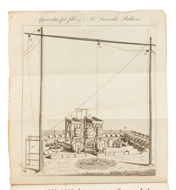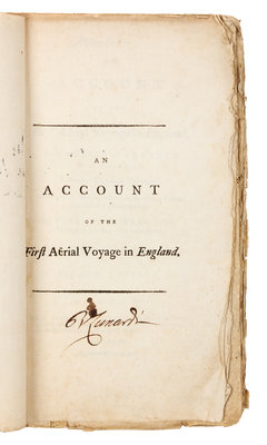 8vo (227 x 133 mm). 2 engraved folding plates; half-title. With an additional stipple-engraved portrait of Lunardi by Bartolozzi laid in. Stab-sewn, uncut, with modern marbled paper on spine; red cloth slipcase. Provenance: "Marten" (signature); 19th-century title inscribed on blank leaf preceding title.FIRST EDITION, second impression, SIGNED BY LUNARDI on half-title, THE ACCOUNT OF THE FIRST BALLOON ASCENT IN ENGLAND. This second impression, printed within weeks of the first impression, is identical in format and content to the first impression except for the addition of "Second Edition" to the title-page. J. A. C. Charles successfully made the first hydrogen balloon ascent on 27 August 1783, taking off from Paris; Montgolfier made his 1783 ascent in a hot air balloon. Following failed attempts by Emile Chevalier and John Sheldon earlier in the year, Lunardi made two ascents from London on 15 September 1784 in his hydrogen balloon named the "Charlire."