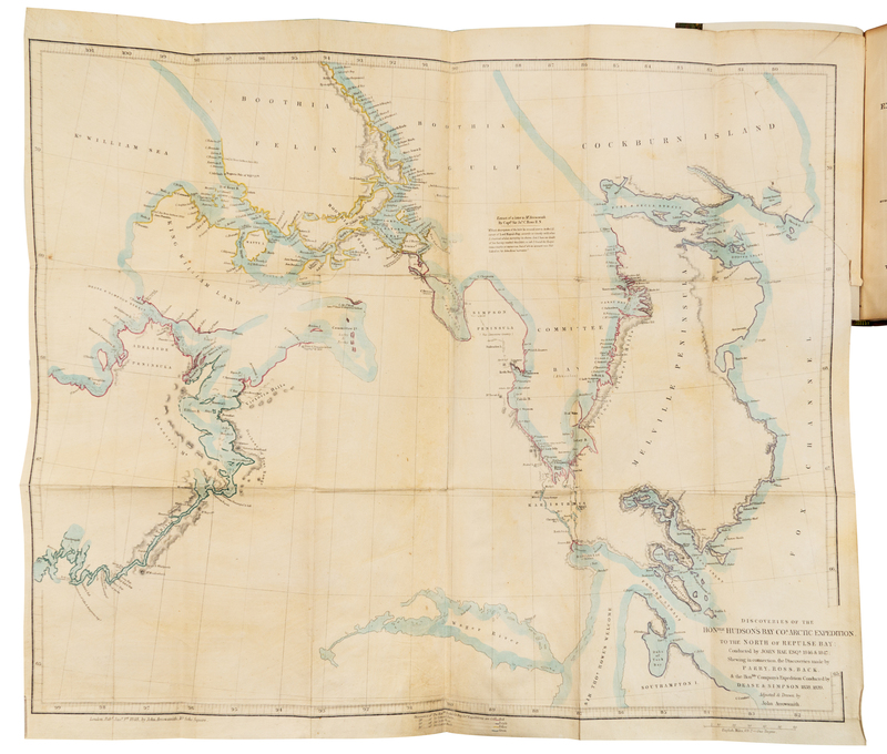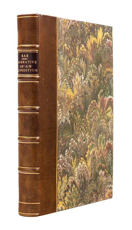 8vo (221 x 136 mm). 2 engraved folding maps (backed with Japan tissue and treated repairing some tears). Modern quarter calf, marbled boards. FIRST EDITION. "The purpose of the expedition, sent out by the Hudson's Bay Co., was to explore and map the arctic coast of Canada from Repulse Bay west to Dease and Simpson's farthest exploration eastward... or if Boothia Felix proved to be a peninsula, to trace the coast north to the place surveyed by John and James Ross, 1829-32. The narrative gives an account of the author's boat journey north from Churchill along the west coast of Hudson Bay to Repulse Bay, portage across Rae Isthmus and exploration of southern Committee Bay; the wintering at Repulse Bay, the spring journeys tracing the shores northwestward around Committee Bay, Simpson Peninsula, Pelly Bay and its islands, to the James Ross...Peninsula..., and northeastward along Melville Peninsula to Cape Crozier" (Arctic Bibliography). At Pelly Bay, Rae was the first to learn the fate of Franklin's expedition from a group of Inuit who sold him a number of Franklin relics including Franklin's Star of the Order of Hanover. Arctic Bibliography 14097; Field 1253; Graff 3415; Sabin 67428; TPL 2868; Streeter sale VI:3715; Wagner-Camp 187.