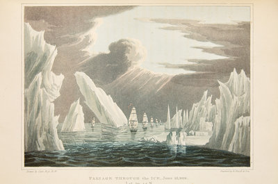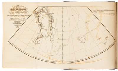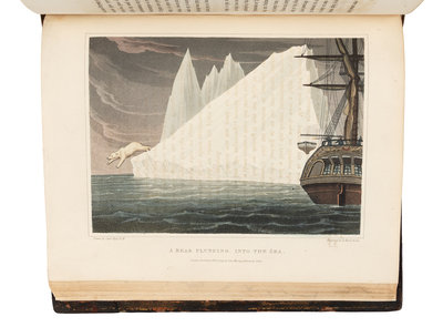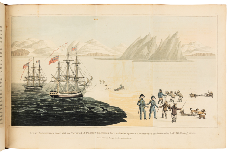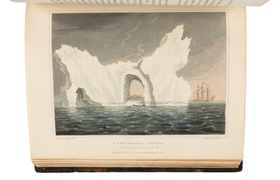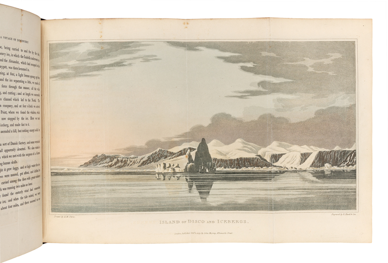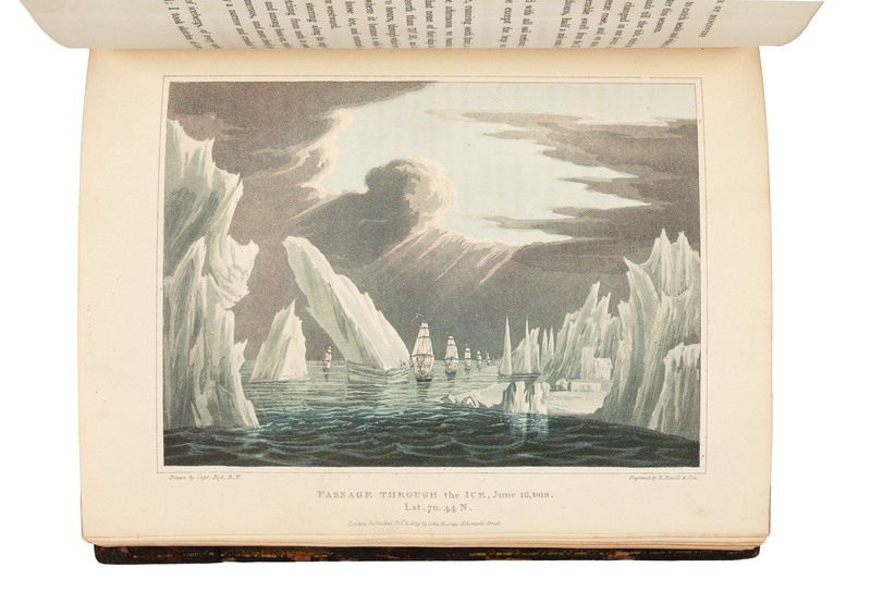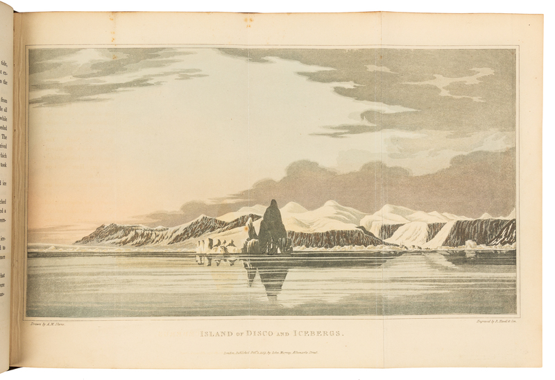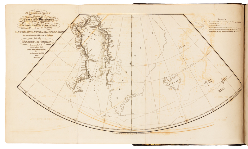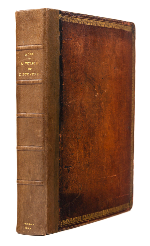 4to (272 x 210 mm). With 3 folding engraved maps, 29 aquatint plates (15 hand-colored). (Some offsetting to maps & plates; maps browned.) Contemporary speckled calf gilt (rebacked in morocco, covers chipped & darkened from fire). FIRST EDITON OF ROSS'S FAMOUS FIRST VOYAGE. Ross, along with William Parry, his nephew James Clark Ross, and Edward Sabine (who would all become famous explorers in their own right) attempted on their journey to proceed westward through Lancaster Sound. Deceived, quite possibly by a mirage, Ross described the passage as barred by a mountain range that he named the Croker Mountains. He then returned to England, losing his only possibility of penetrating the Northwest passage. His observations were initially accepted as conclusive, and he was promoted to post rank on 7 December 1818. Controversy would soon follow, as Sir John Barrow, furious that the attempt to find the open polar sea had failed, vented his anger in person to Ross, and the Admiralty, having learned that there were some doubts as to the existence of the Croker Mountains, dispatched another expedition under the command of Parry. Edward Sabine, in his account of the voyage, claimed that Ross was the only person to have seen the Croker Mountains and that he had misrepresented some scientific results of the voyage. Parry's return in 1820 brought further proof that Ross's assertions had been incorrect, and, despite his willingness to make another voyage, Ross was not given another opportunity to lead an Arctic expedition until 1829. Abbey Travel 634; Arctic Bibliography 14873; Hill 1488; NMM 818; Sabin 73376; TPL 1152.