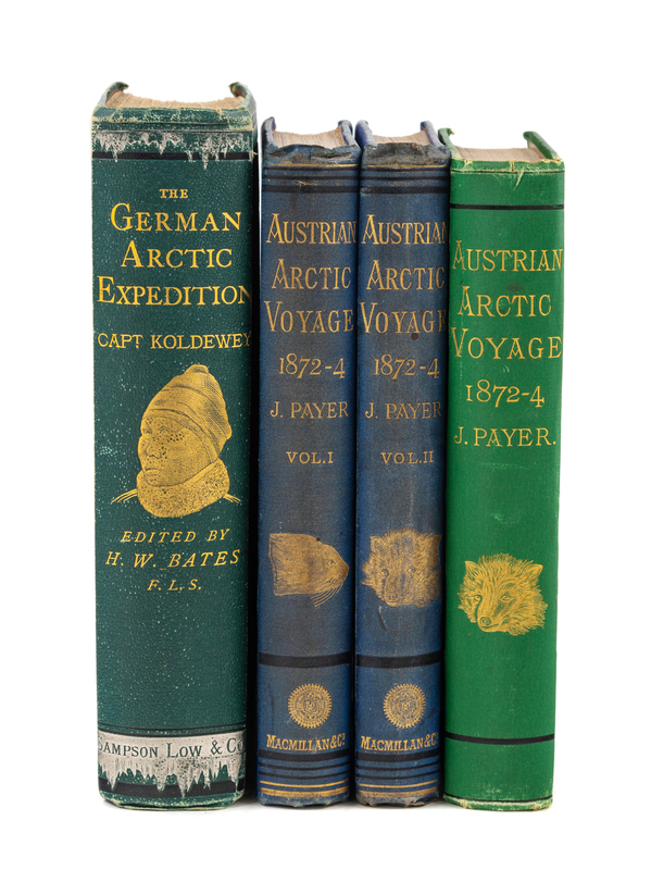 KOLDEWEY, Karl (1837-1908). The German Arctic Expedition of 1869-70, and Narrative of the Wreck of the Hansa in the Ice. London: Sampson Low, 1874. 8vo. Chromolithographic frontispiece, 2 color-printed folding maps, numerous plates and illustrations. -- PAYER, Julius (1842-1915). New Lands Within the Arctic Circle. Narrative of the Discoveries of the Austrian Ship Tegetthoff in the Years 1872-1874. London: Macmillan and Co., 1876. 2 volumes, 8vo. Chromolithographic frontispiece, 2 double-page route maps, numerous plates and in-text illustrations. -- PAYER, Julius (1842-1915). New Lands Within the Arctic Circle. Narrative of the Discoveries of the Austrian Ship Tegetthof in the Years 1872-1874. New York: D. Appleton, 1877. 8vo. Chromolithographic frontispiece, 2 double-page route maps, and numerous full-page or in-text wood-engravings. Later edition, first in Vienna and London in 1876. -- Together, 3 works in 4 volumes, FIRST EDITIONS in English except where indicated, all in original publisher's cloth, condition generally good.