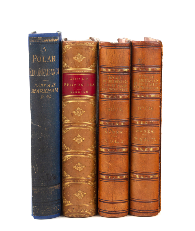 [With:]MARKHAM, Albert Hastings, Sir (1841-1918). The Great Frozen Sea. A Personal Narrative of the Voyage of the Alert During the Arctic Expedition of 1875-76. London: Daldy, Isbister, 1878. 8vo. Maps (one folding and color-printed), numerous plates (2 double-page) and in-text illustrations. Contemporary half tan calf gilt, red lettering-piece gilt, marbled boards. FIRST EDITION. -- MARKHAM, Albert Hastings, Sir (1841-1918). A Polar Reconnaissance, being The Voyage of the Isbjrn to Novaya Zemlya in 1879. London: Kegan Paul, 1881. 8vo. 2 folding maps, 6 wood-engraved plates from photographs, in-text wood engravings. Publishers decorated blue cloth gilt.