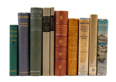 SCORESBY, William (1789-1857). Journal of a Voyage to the Northern Whale-Fishery...on the Eastern Coast of West Greenland. Edinburgh: and London, 1823. 8vo. Numerous maps and plates (some folding). Tan half calf and marbled boards. -- HAYES, Isaac Israel (1832-1881). The Land of Desolation. Being a Personal Narrative of Observation and Adventure in Greenland. New York, 1872. 8vo. Frontispiece, numerous wood-engraved plates and in-text vignettes. -- FRIIS, Achton (1871-1939). Danmark Ekspeditionen til Gronlands Nordostkyst. Copenhagen, 1909. 8vo. Folding map, numerous plates and half-tones. -- RASMUSSEN, Knud Johan Victor (1879-1933). Greenland by The Polar Sea. London, 1921. 8vo. Folding map, numerous plates. FIRST EDITION IN ENGLISH. -- GEORGI, Johannes. Mid-Ice. The Story of the Wegener Expedition to Greenland. London, 1934. 8vo. Frontispiece, map, numerous half-tones. FIRST EDITION IN ENGLISH. -- BOYD, Louise Arner (1887-1972), et al. The Fiord Region of East Greenland. New York, 1935. 2 volumes, 8vo. Frontispiece, numerous plates and maps. -- LINDSAY, Martin (1905-1981). Sledge. The British Trans-Greenland Expedition, 1934. London, 1935. 8vo. Frontispiece portrait, 5 maps (one folding), numerous illustrations. -- STEFANSSON, Vilhjalmur (1879-1962). Greenland. New York: Doubleday, Doran, 1942. 8vo. Numerous plates and in-text illustrations. Original dust jacket. -- KENT, Rockwell (1882-1971). Greenland Journal. New York: Ivan Obolensky, 1962. 8vo. Numerous illustrations. Original dust jacket. -- Together, 9 works in 10 volumes, all first editions, all in original publishers cloth except where noted, condition generally good.