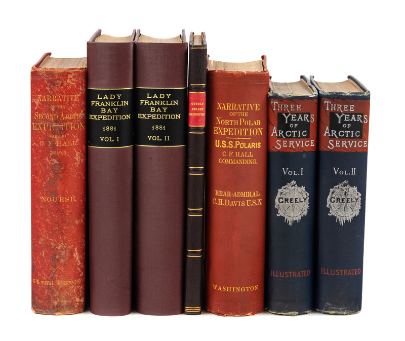 DAVIS, Charles Henry (1807-1877). Narrative of the North Polar Expedition. U.S. Ship Polaris. Captain Charles Francis Hall Commanding. Washington: Government Printing Office, 1876. 8vo. 6 lithographic maps, numerous plates and illustrations. -- HALL, Charles Francis (1821-1871). Narrative of the Second Arctic Expedition. Washington: Government Printing Office, for the U.S. Naval Observatory, 1879. 8vo. Color-printed folding map mounted on linen (as issued), numerous plates, portraits, and illustrations. -- GREELY, Adolphus W. (1844-1935). Three Years of Arctic Service. An Account of the Lady Franklin Bay Expedition of 1881-84 and the Attainment of the Farthest North. New York: Charles Scribners, 1886. 2 volumes, 8vo. 7 maps (3 folding), numerous plates and illustrations. -- SCHLEY, Winfield S. (1839-1911). Report of Winfield S. Schley, Commander, U.S. Navy, commanding Greely Relief Expedition of 1884. Washington: Government Printing Office, 1887. 4to. Frontispiece portrait, 3 route maps, numerous plates. -- GREELY, Adolphus W. (1844-1935). Report of the Proceedings of the United States Expedition to Lady Franklin Bay, Grinnell Land. Washington: Government Printing Office, 1888. 2 volumes, 4to. 6 maps and charts (one folding), numerous plates and illustrations. Modern red cloth gilt. FIRST EDITION. -- Together, 5 works in 7 volumes, all FIRST EDITIONS, all in original publisher's cloth except where indicated, condition generally good.