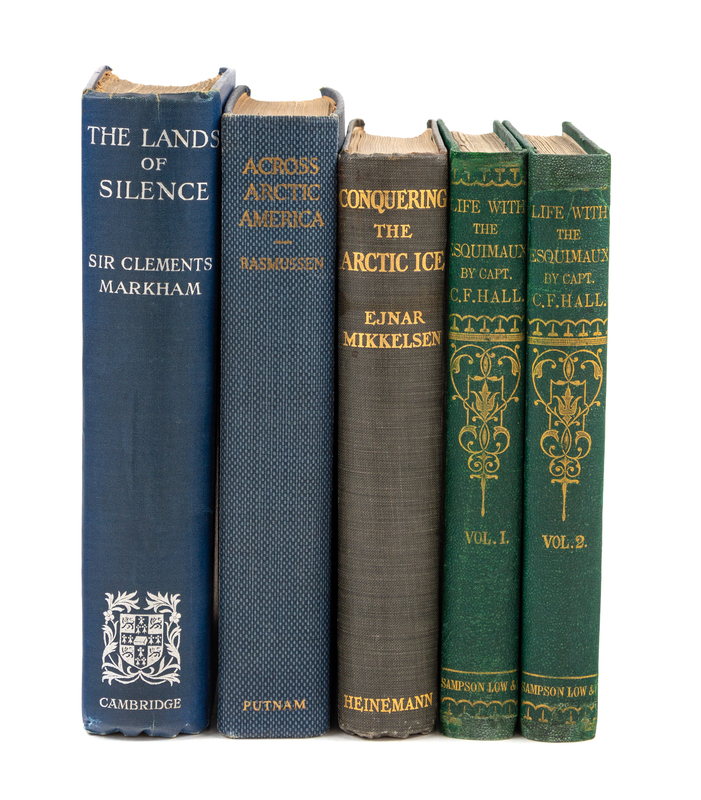 HALL, Charles Francis (1821-1871). Life with the Esquimaux... London: Sampson Low, 1864. 2 volumes, 8vo. Frontispiece portrait, 3 maps (1 folding), numerous plates and illustrations. -- MIKKELSEN, Ejnar (1880-1971). Conquering the Arctic Ice. London: William Heinemann, 1909. 8vo. Frontispiece, folding route map, numerous half-tones. -- MARKHAM, Clements Robert, Sir (1830-1916).The Lands of Silence. A History of Arctic and Antarctic Exploration.Cambridge: The University Press, 1921. 8vo. 2 folding maps, 26 photographic plates. -- RASMUSSEN, Knud Johan Victor (1879-1933). Across Arctic America. Narrative of the Fifth Thule Expedition. New York: G.P. Putnams, 1927. 8vo. 4 maps (1 folding), numerous plates from photos. -- Together, 4 works in 5 volumes, condition generally good. All FIRST EDITIONS, all in original publisher's cloth, condition generally good.