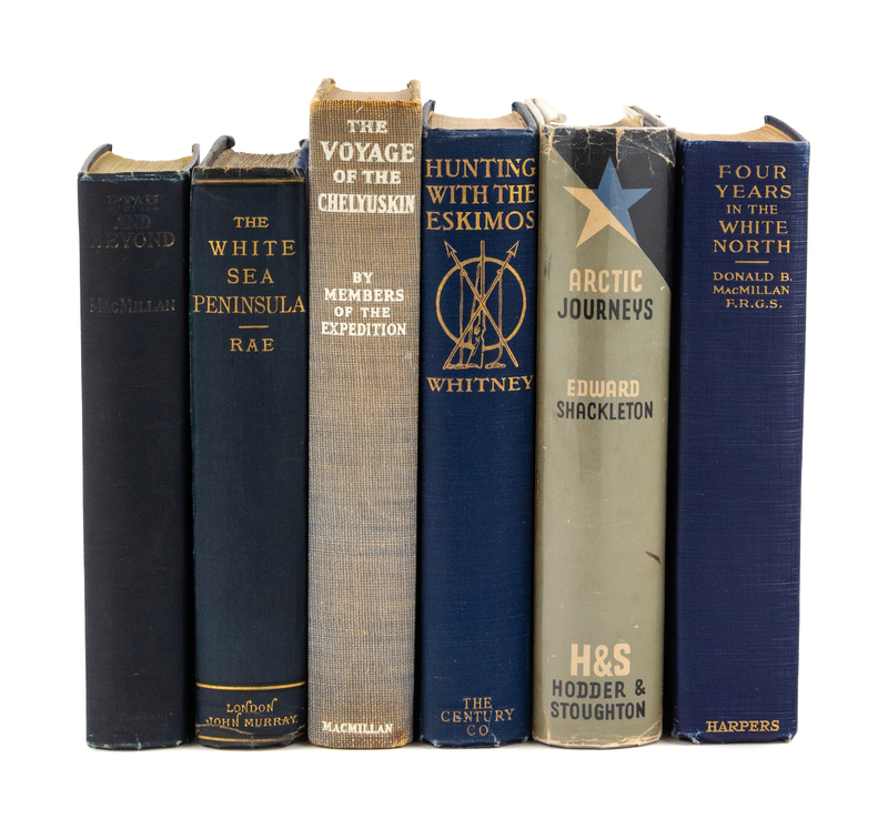SHACKLETON, Edward. Arctic Journeys The Story of the Oxford University Ellesmere Land Expedition 1934-5. London: Hodder and Stoughton Limited, [1937]. 8vo. Folding map, illustrated. With original dust jacket. PUBLISHER'S REVIEW COPY with review slip laid in dated 1 February 1937. -- RAE, Edward (b. 1847). The White Sea Peninsula, A Journey in Russian Lapland and Karelia. London: John Murray, 1881. 8vo. Photogravure frontispiece, folding map in rear cover pocket, numerous engraved plates. -- WHITNEY, Harry (1873-1936). Hunting with the Eskimos. New York: Century Co., 1910. 8vo. Frontispiece and photographic plates. -- MACMILLAN, Donald B. (1874-1970).Four Years in the White North. New York: Harper & Bros., 1918. 8vo. Frontispiece, 3 maps, numerous plates. -- MACMILLAN, Donald B. (1874-1970). Etah and Beyond, or Life within Twelve Degrees of the Pole. Boston: Houghton Mifflin, 1927. 8vo. Frontispiece portrait, 2 maps, numerous photographic plates. -- BROWN, Alex, translator. The Voyage of the Chelyuskin. New York: The Macmillan Company, 1935. Provenance: Leonard Kahn (signature). -- All FIRST EDITIONS, all in original publisher's cloth, condition generally good.