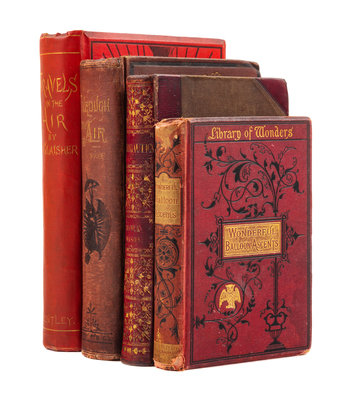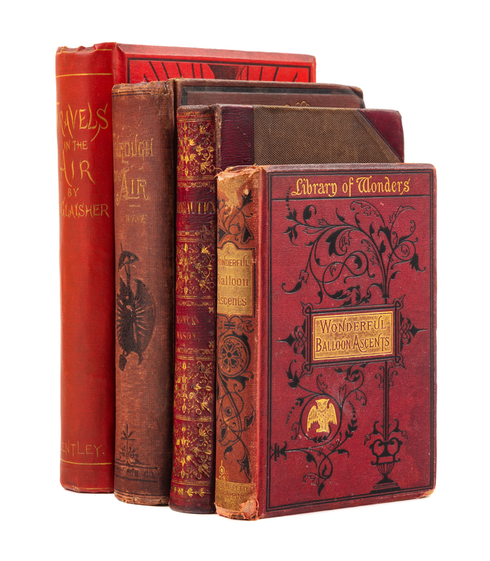 MASON, Thomas Monck (1883-1889). Aeronautica; or, Sketches Illustrative of The Theory and Practice of Aerostation. London: F.C. Westley, 1838. 8vo. Frontispiece, 5 lithographed plates (3 linen-backed). Contemporary maroon half morocco gilt (slightly rubbed). Provenance: George B. Gale (gift inscription to); Charles Henry Browne (1872-1917) New Zealand Military Forces officer. FIRST EDITION. -- GLAISHER, James, editor (1809-1903). Travels in the Air, by James Glaisher, Camille Flammarion, W. de Fonville, and Gaston Tissandier. London: Richard Bentley, 1871. 8vo. Frontispiece map, numerous plates and in-text illustrations. FIRST ENGLISH EDITION. -- WISE, John (1808-1879). Through the Air: A Narrative of Forty Years' Experience as an Aeronaut. Philadelphia and San Francisco: To-Day Printing & Publishing Co., F. Dewing & Co., 1873. 8vo. Chromolithographic frontispiece, numerous engraved plates. (Some light soiling.) FIRST EDITION. -- MARION, F. Wonderful Balloon Ascents. London: Cassell, Peter, adn Galpin, n.d. 8vo. Illustrated. -- All in original publisher's cloth, condition generally good.