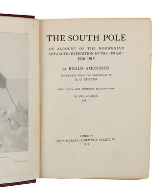 2 volumes, 8vo. With 2 frontispiece portraits, 2 folding maps, and photographic plates. (1 map stained.) Original publisher's cloth (recased with new endpapers; covers spotted). FIRST ENGLISH EDITION. On December 14, 1911 Amundsen and four members of his expedition became the first to reach the South Pole, their new route being from the Bay of Whales in the Ross Sea and directly to the Pole over the Axel Heiberg Glacier, en route discovering the Queen Maud Mountains. They remained at the Pole three days confirming their observations, left a note for Scott, and returned to Framheim on January 25th. The book was published before the tragic fate of Captain Scott's rival expedition was publicly known. This copy is bound in the publisher's remainder binding without color illustration on covers. Conrad, p 156; Renard 17; Rosvoe 9.A1; Spence 16; Taurus 71.