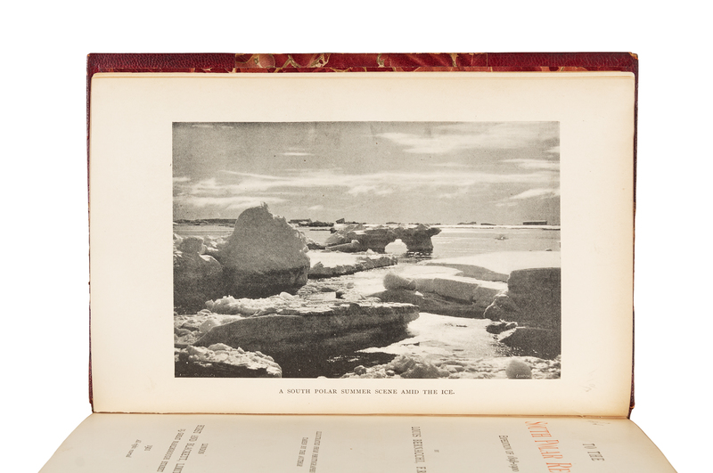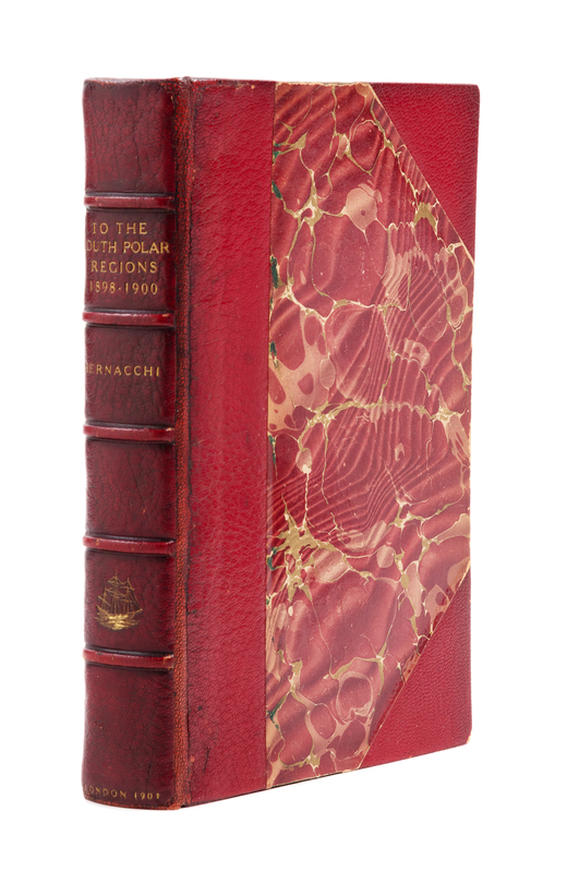 8vo. With 2 folding maps, 47 illustrations on 43 leaves, folding panorama (split along folds). Contemporary half morocco by Stikeman and Co. (rebacked preserving original spine). FIRST EDITION. Bernacchi, the first Australian to set foot on the Antarctic continent, relates the first deliberate wintering in Antarctica on the Southern Cross expedition of 1898-1900 (see next lot). "Bernacchi's account is a gem in the Antarctic literature To him we are indebted for many beautiful literary images of the voyage. Bernacchi was only twenty-six at the time of publication but had an unmistakable writing ability, amply confirmed in his subsequent literary output; the work is attractively illustrated with photographs taken by the author" (Rosove). Rosove 35.A1; Spence 123; Taurus Collection 25.