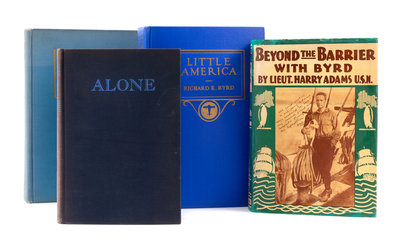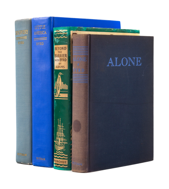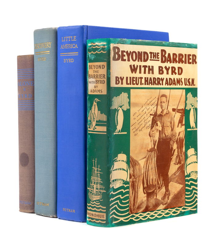 BYRD. Little America: Aerial Exploration in the Antarctic. The Flight to the South Pole. New York: G.P. Putnam's, 1930. 8vo. Frontispiece portrait, 4 maps (2 folding), numerous photographic plates. -- BYRD. Discovery: The Story of the Second Byrd Antarctic Expedition. New York: G.P. Putnam's, 1935. 8vo. Frontispiece portrait, numerous photographic plates, one map. -- BYRD. Alone. New York: G.P. Putnam's, 1938. 8vo. SIGNED BY BYRD on second blank. -- ADAMS, Harry, Lieutenant (b. 1876). Beyond the Barrier with Byrd: An Authentic Story of the Byrd Antarctic Exploring Expedition. Chicago: M.A. Donohue & Co., 1932. 8vo. Numerous plates. -- All FIRST EDITIONS, all in original publisher's cloth, condition generally fine.