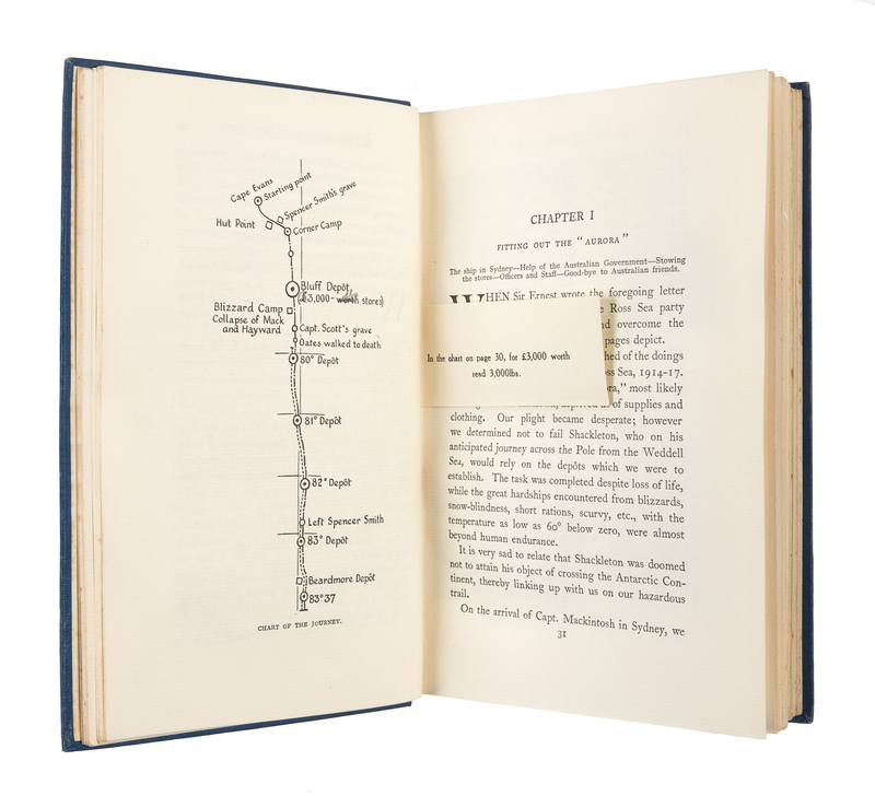 8vo. With 32 plates; issue with the errata slip. Original publisher's blue cloth gilt. Provenance: Norah Enderby (signature, 1930). FIRST EDITION of "the principal firsthand account of the Ross Sea shore party of Shackleton's 1914-17 expedition" (Rosove). Written by the veteran of four Antarctic expeditions, this work comprises Joyce's log from the Imperial Trans-Antarctic Expedition, as a member of the Ross Sea party whose mission was to lay supply depots for Shackleton's group as they traversed the continent. Famously, Shackleton's 'Endurance' was crushed in pack ice before it could land, and the depots were never used. Three members of the Ross Sea party died during the expedition, but their story is often overshadowed by Shackleton's exploits. Renard 821; Rosove 188.A1.a; Spence 642. A fine copy.