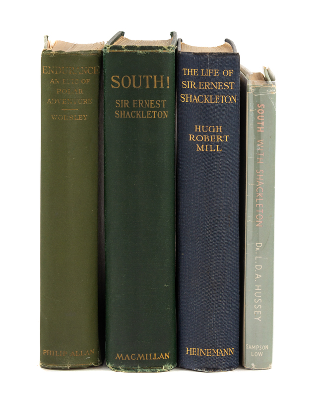 SHACKLETON, Ernest, Sir. South. The Story of Shackleton's Last Expedition 1914-1917. New York: Macmillan, 1920. 8vo. Folding map, frontispiece, numerous plates. FIRST AMERICAN EDITION. -- WORSLEY, Frank Arthur. Endurance. An Epic of Polar Adventure. London: Philip Allan & Co., 1931. Numerous plates. -- MILL, Hugh Robert. The Life of Sir Ernest Shackleton. London: William Heinemann, 1923. 8vo. Frontispiece, numerous plates. -- HUSSEY, Leonard Duncan Albert (1891-1964). South with Shackleton. London: Sampson Low, 1949. 8vo. Numerous woodcut illustrations. Original dust jacket. -- All FIRST EDITIONS, all in original publisher's cloth, condition generally good.