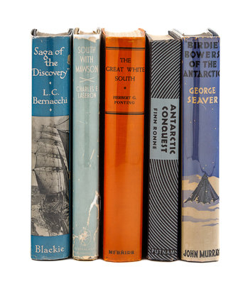 BERNACCHI, Louis. Saga of the "Discovery." London: Blackie & Son, 1938. FIRST EDITION. - LASERON, Charles F. South with Mawson: Reminiscences of the Australasian Antarctic Expedition, 1911-1914. Sydney: Australasian Publishing Co., 1947. FIRST EDITION. - POINTING, Herbert G. The Great White South, or With Scott in the Antarctic: Being an account of experiences with Captain Scott's South Pole Expedition and of the nature of life in the Antarctic. New York: Robert M. McBride, 1923. - RONNE, Finn. Antarctic Conquest: The Story of the Ronne Expedition 1946-1948. New York: G.P. Putnam's, 1949. FIRST EDITION. -- SEAVER, George. 'Birdie' Bowers of the Antarctic. London: John Murray, 1933. FIRST EDITION. -- With 8 others. Together, 13 works in 13 volumes, many first editions and most original publisher's bindings, condition generally fine, complete list available on request.