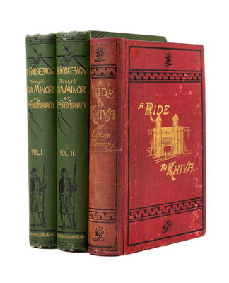 [With:]BURNABY. On Horseback through Asia Minor. In Two Volumes. London: Sampson Low, Marston et al, 1877. 2 volumes, 8vo. Frontispiece portrait, 3 folding maps, ads on rear paste-downs and endpapers. Publisher's decorated green cloth gilt.