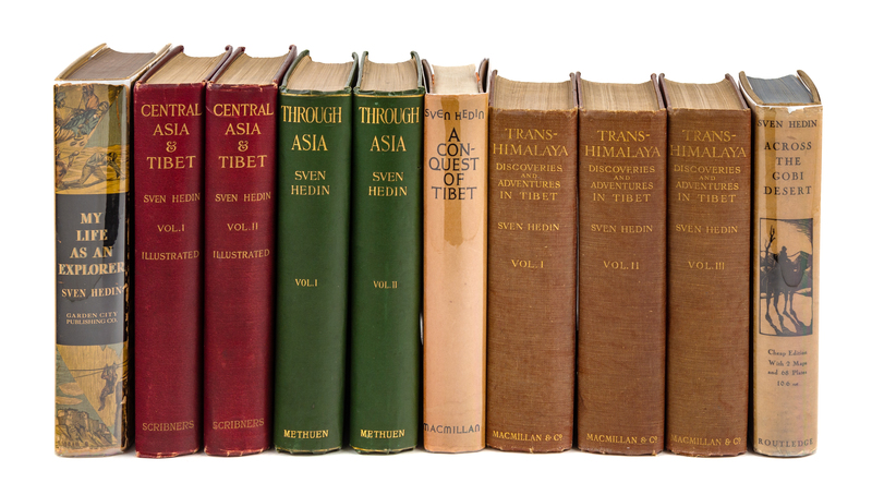 Through Asia. New York: Harper & Bros., 1899. 8vo. Photogravure frontis. portraits of the Author and Islam Bai, 2 folding maps, numerous plates and illustrations. FIRST AMERICAN EDITION. -- Central Asia and Tibet. Towards the Holy City of Lassa. New York: Scribners, 1903. 2 volumes, 8vo. 5 folding maps, numerous color plates and illustrations. FIRST AMERICAN EDITION. -- Trans-Himalaya. Discoveries and Adventures in Tibet. London: Macmillan, 1910, 1913. 3 volumes, 8vo. Frontispieces, 14 maps (4 of which are folding route maps), numerous illustrations. FIRST ENGLISH EDITION. -- My Life as an Explorer. New York: Garden City Publishing, 1925. 8vo. Numerous maps and illustrations. FIRST EDITION. -- Across the Gobi Desert. London: Routledge, 1931. 8vo. 2 color-printed folding maps, a sketch map, numerous photo plates. With second issue dust jacket. FIRST ENGLISH EDITION. -- A Conquest of Tibet. London: Macmillan, 1935. 8vo. Numerous illustrations. With the rare dust jacket. FIRST ENGLISH EDITION. -- Together, 6 works in 10 volumes, all in original publishers cloth, condition generally good.