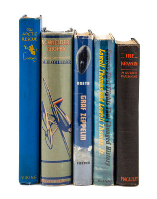 LUNDBORG, Einar. The Arctic Rescue: How Nobile was Saved. New York: 1929. -- ORLEBAR, A.H. Schneider Trophy: A Personal Account of High-Speed Flying & the Winning of the Schneider Trophy. London: 1933. -- PARIJANINE, Maurice. The Krassin. New York: 1929. -- THOMAS, Lowell and Lowell Thomas Jr. Famous First Flights That Changed History. New York: 1968. -- VAETH, J. Gordon. Graf Zeppelin: The Adventures of an Aerial Globetrotter. New York: 1958. -- And 8 others. Together, 13 works in 13 volumes, most FIRST EDITIONS, most original publisher's bindings, condition generally fine, complete list available on request.