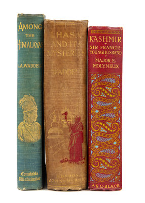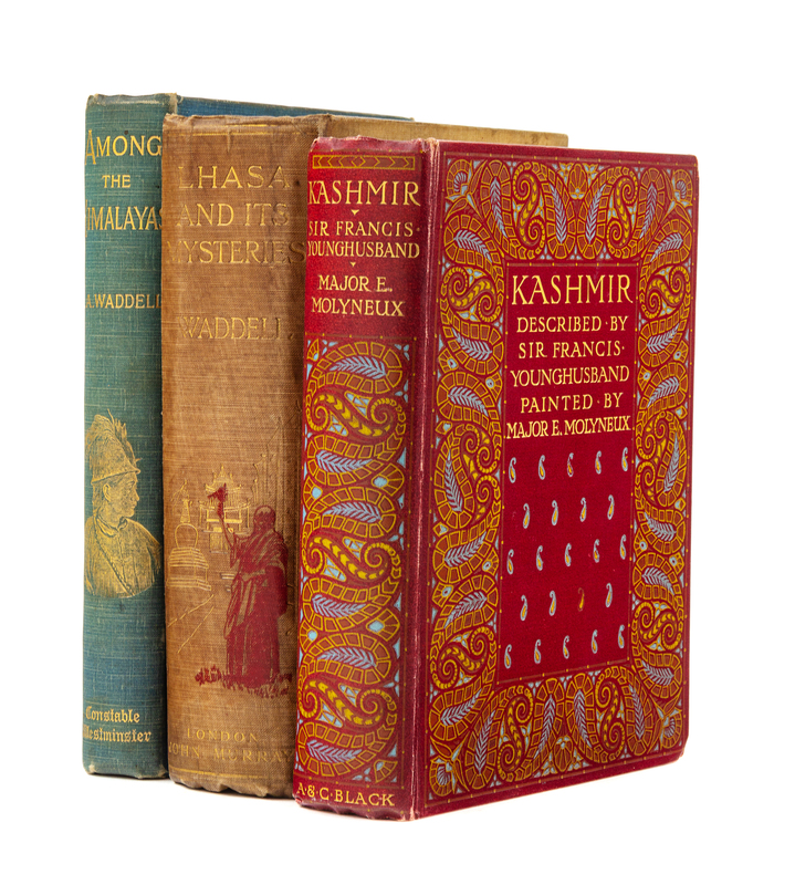 WADDELL, L.A. (1854-1938). Among the Himalayas. London: Archibald Constable, 1899. 8vo. 4 maps (1 color-printed folding map). (With slight spotting on preliminary and last leaves.) 28 full-page plates numerous in-text illustrations. -- WADDELL, L.A. (1854-1938). Lhasa and Its Mysteries.With a Record of the Expedition of 1903-1904. London: John Murray, 1905. 8vo. 8 maps (one folding color map), numerous plates. -- YOUNGHUSBAND, Francis Edward, Sir (1863-1942). Kashmir. London: A. & C. Black, 1909. 8vo. Folding map, 70 color plates. All FIRST EDITIONS, all in original publishers cloth, condition generally good.