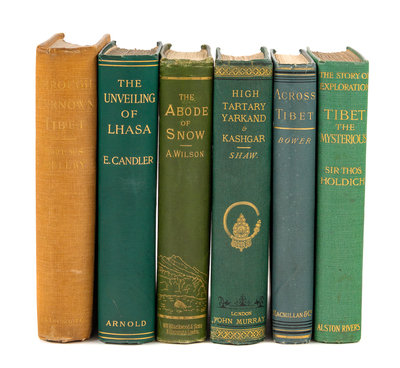 SHAW, Robert Barkley (1839-1879). Visits to High Tartary, Yarkand, and Kashgar (Formerly Chinese Tartary) and return journey over the Karakoram Pass. London: John Murray, 1871. 8vo. Engraved title-page vignette, 2 folding maps, numerous and in-text illustrations. -- WILSON, Andrew (1831-1881). The Abode of Snow. Observations of a Journey from Chinese Tibet to the Indian Caucasus, through the Upper Valleys of the Himalaya. Edinburgh: William Blackwood, 1875. 8vo. Lithotint frontispiece, large folding map in rear cover pocket. -- BOWER, Hamilton (1858-1940). Diary of a Journey Across Tibet. New York: Macmillan, 1894. 8vo. Color-printed folding map, folding altitude profile, frontispiece, numerous illustrations. FIRST AMERICAN EDITION. -- WELBY, Montagu Sinclair (1866-1900). Through Unknown Tibet. Philadelphia: Lippincott, 1898. 8vo. Photogravure frontispiece portrait, 4 folding maps in rear cover pocket, numerous plates and illustrations.FIRST AMERICAN EDITION. -- CANDLER, Edmund (1874-1926). The Unveiling of Lhasa. London: Edward Arnold, 1905. 8vo. Large folding map, a color frontispiece, numerous plates. FIRST EDITION, PUBLISHERS FILE COPY. -- HOLDICH, Thomas Hungerford, Sir (1843-1929). Tibet, the Mysterious. London: Alston Rivers, [1906]. 8vo. Color-printed folding map,sketch maps (one folding), numerous plates. -- All FIRST EDITIONS, all in original publishers cloth, condition generally good.