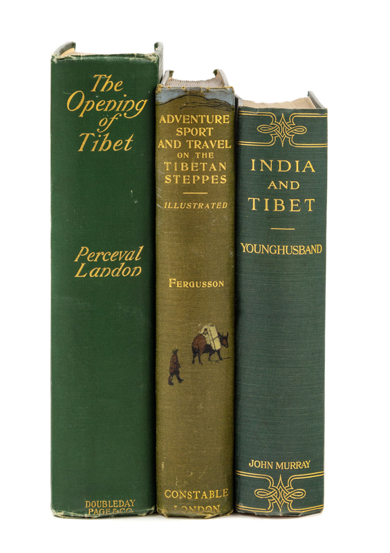 YOUNGHUSBAND, Francis Edward, Sir (1863-1942). India and Tibet. A history of the relations which have subsisted between the two countries... London: John Murray, 1910. 8vo. 2 color-printed folding maps and 26 plates. FIRST EDITION. AUTHORS COMPLIMENTS SLIP LAID IN. -- LANDON, Perceval (1869-1927). The Opening of Tibet. An account of Lhasa and the country and people of Central Tibet and of the progress of the mission sent there by the English Government in the year 1903-4. New York: Doubleday, Page, 1905. 8vo. Color frontispiece, numerous plates. FIRST AMERICAN EDITION.-- FERGUSON, W.N. Adventure, Sport and Travel on the Tibetan Steppes. London: Constable, 1911. 8vo. Photogravure frontispiece, folding map, numerous photo plates. FIRST EDITION. -- All FIRST EDITIONS, all in original publishers cloth, condition generally good.