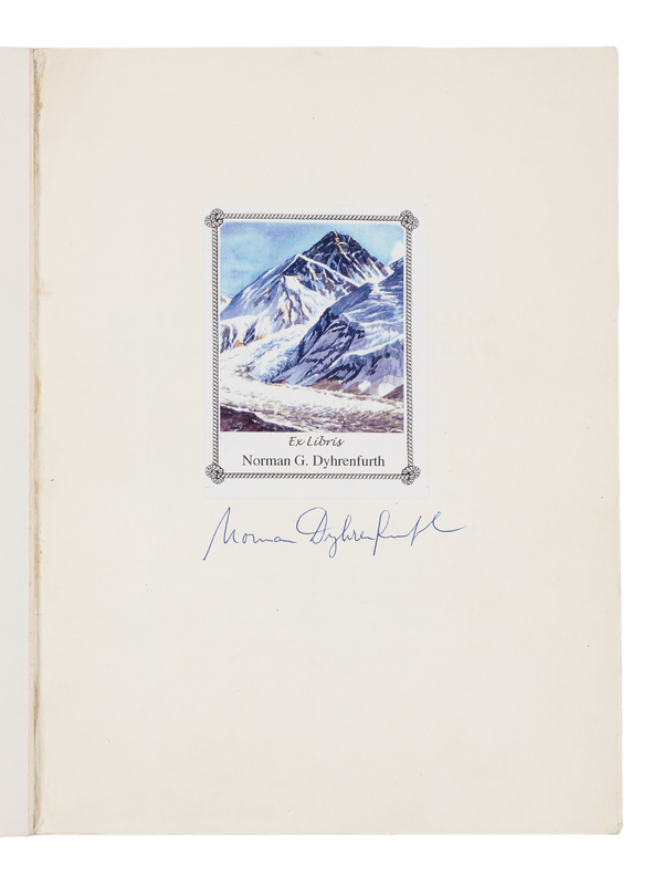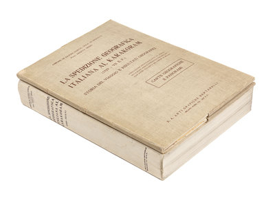 2 volumes, 4to. With 4 folding maps, 5 folding panoramas, numerous photogravure plates. Original printed wrappers (neatly rebacked). Provenance: Norman Dyhrenfurth (1918-2017) mountaineer and filmmaker, son of Gnter Oskar Dyhrenfurth, mountaineer and Himalayan explorer (bookplate). FIRST TRADE EDITION, with superb photographs by Massimo Terzano, recounting the 1929 Italian expedition to the Karakoram led by the Duke di Spoleto. One party explored and mapped the headwaters of the Baltoro, and the other crossed the East Mustagh pass and the glaciers on the north side of K2 to follow the course of the Saksgam River. Perret 1299.