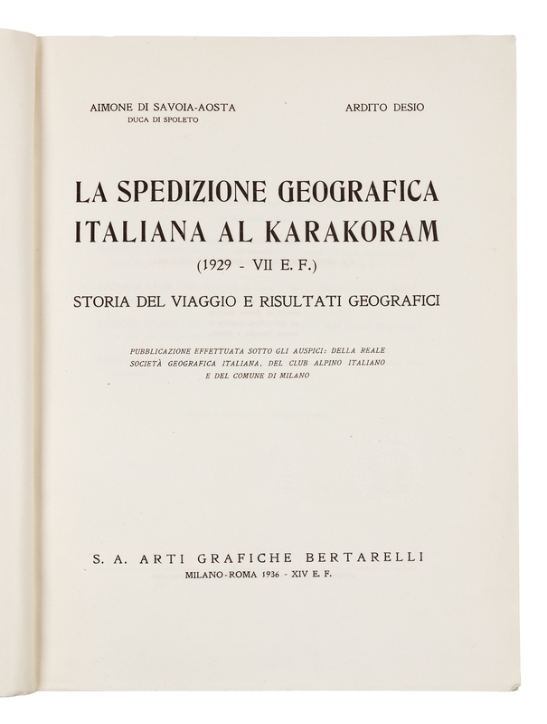 AIMONE, Duca di Savoia-Aosta Spoleto (1900-1948); DESIO, Ardito (1897-2001). La Spedizione Geografica Italiana al Karakoram. 1929. Stor