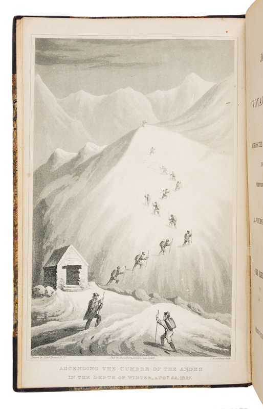 8vo (211 x 130 mm). With 4 aquatint plates (lacking half-title). Contemporary half black calf gilt, marbled boards. Provenance: John Horne, Esq. (presentation inscription). FIRST EDITION, PRESENTATION COPY, inscribed by Brand: "To John Horne Esq. with the authors kind regards". Brand crossed the Pampas by horse and traversed the Cordillera of the Andes on foot past Aconcagua to Valparaiso and Santiago, returning across the Andes to Buenos Aires. Neate B151.