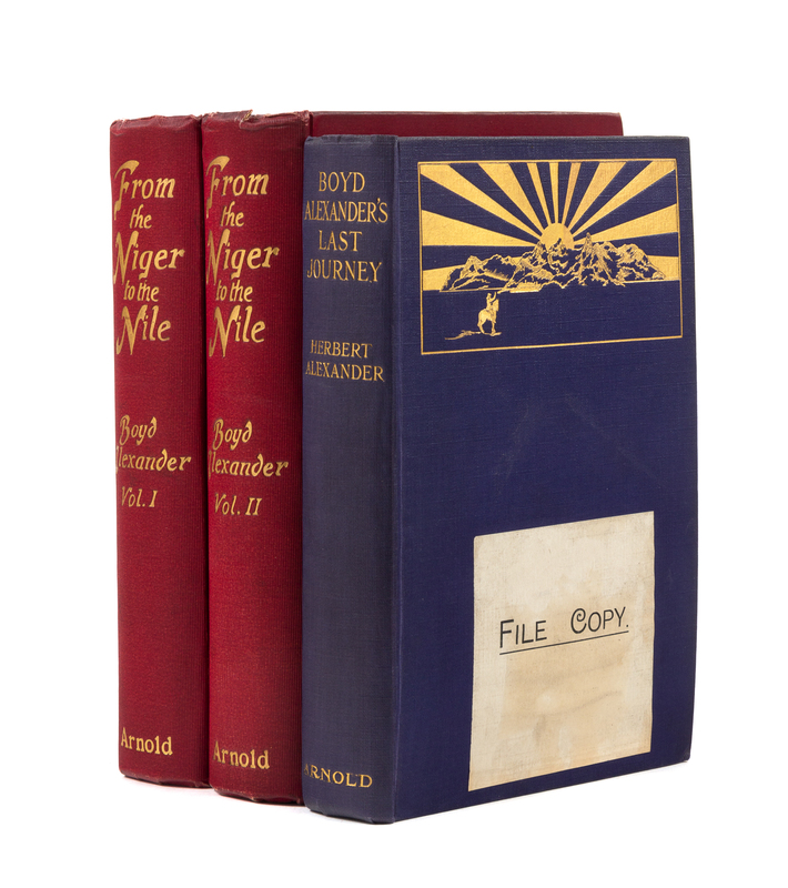 [With:]ALEXANDER. From the Niger to the Nile. London: Edward Arnold, 1907. 2 volumes, 8vo. Frontispiece portraits, numerous plates and in-text illustrations, 3 color-printed folding maps. Publisher's ribbed red cloth gilt. FIRST EDITION, PUBLISHER'S FILE COPY, with printed paper labels ("File Copy") affixed to upper covers.