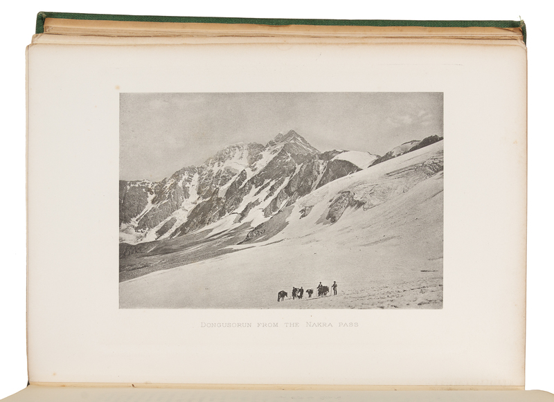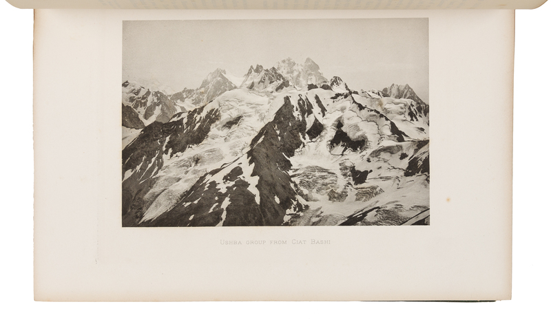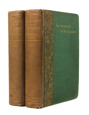 2 volumes, 4to. With 76 photogravure plates on heavy paper, 3 folding photogravure panoramas, & 3 folding maps (one folding to rear cover pocket). (Some light spotting to a few leaves.) Original publisher's decorated green cloth gilt (spines slightly darkened). Provenance: Arthur Gardner, British mountaineer and author of The Art and Sport of Alpine Photography (pencil inscription). FIRST TRADE EDITION. Freshfield made expeditions to the Caucasus in 1868, 1887, and 1889, and traversed the chain 11 times by 8 different passes. Here he compiles historical and geographical information about the Caucasus, including accounts from Dent, Donkin, Mummery, Wooley, Dechy, and Sella. Neate F64; Perret 1759. A FINE ASSOCIATION COPY.