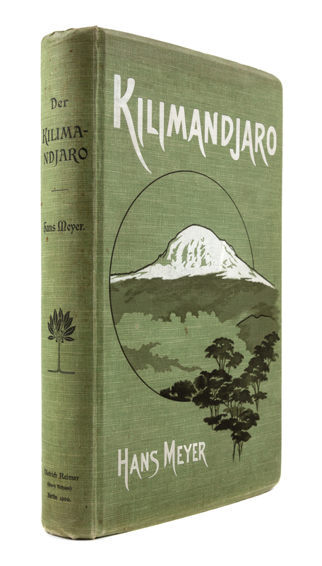 8vo. With 2 folding color-printed maps (one folding in rear cover pocket), 4 chromolithographic plates, 16 photogravures on thick paper & 20 photographic plates (including 3 panoramas). Original publisher's green cloth gilt. FIRST EDITION, giving a detailed account of Meyer's ascent of Kilimanjaro, first described in Across East African Glaciers (see previous lot). Kilimanjaro's second highest peak, Mawenzi, is also known as Hans Meyer Peak. Perret 2988.