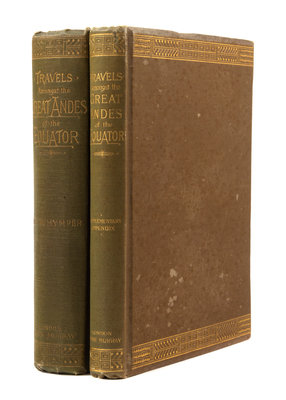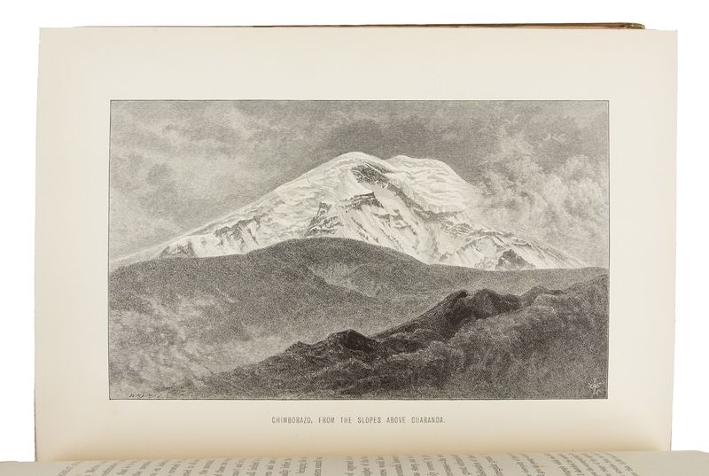 2 volumes (including Supplementary Appendix), 8vo. With 34 engraved plates & 4 maps (one folding, one large folding route map in rear cover pocket). Original publisher's green cloth gilt (covers slightly faded or spotted). Provenance: David Mac Brayne (armorial bookplate). FIRST EDITIONS. Whymper made first ascents of Chimborazo and Cotopaxi (among others) and intended to "observe the effects of low pressure, and to attain the greatest possible height in order to experience it." The Supplement includes descriptions of the Coleoptera and Lepidoptera by H. W. BATES and others, and the Geology by T. G. BONNEY. Neate W66.
