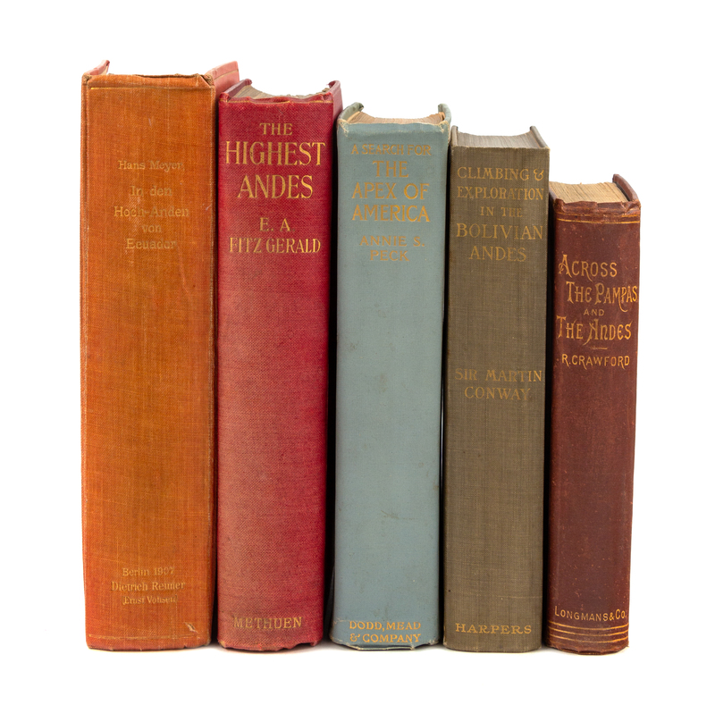 CRAWFORD, Robert (1834-1898).Across the Pampas and The Andes. London: Longmans, 1884. 8vo. Large folding map, wood-engraved plates. -- FITZ GERALD, Edward Arthur (1871-1931). The Highest Andes. A Record of the First Ascent of Aconcagua and Tupungato in Argentina, and the Exploration of the Surrounding Valleys. London: Methuen & Co., 1899. 8vo. 2 color-printed folding maps, 2 photo panoramas, numerous photo plates. -- CONWAY, Martin, Sir (1856-1947). The Bolivian Andes. A Record of Climbing & Exploration in the Cordillera Real in the Years 1898 and 1900. New York: Harper & Bros., 1901. 8vo. Numerous half-tones. FIRST AMERICAN EDITION. -- MEYER, Hans Heinrich Joseph (1858-1929). In den Hoch-Anden von Ecuador: Chimborazo, Cotopaxi etc. Reisen und Studien. Berlin: Dietrich Reimer, 1907. 8vo. 3 color-printed folding maps, numerous half-tones and plates. -- PECK, Annie S. (1850-1935). A Search for The Apex of America. High Mountain Climbing in Peru and Bolivia including the Conquest of Huascaran. With Observations of the Country and People Below. New York: Dodd, Mead, 1911. 8vo. Frontispiece portrait, folding map, numerous half-tones. -- -- All FIRST EDITIONS except where indicated, all in original publishers cloth, condition generally good.