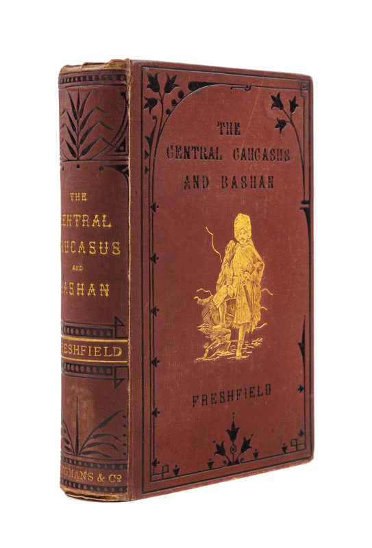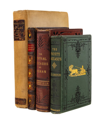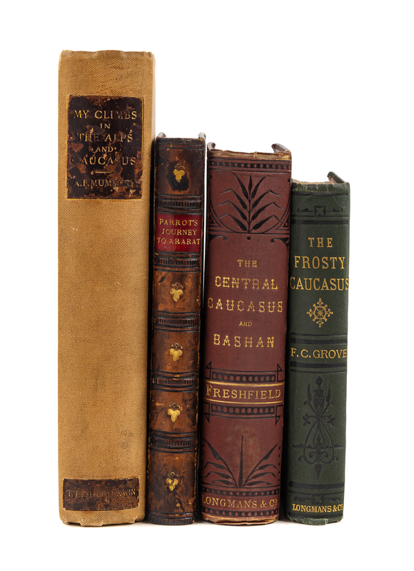 PARROT, Friederich (1791-1841). Journey to Ararat. London: Longman, Brown, et al, (1845). 8vo. Engraved folding map. Contemporary calf, bevelled edges. FIRST EDITION IN ENGLISH. -- FRESHFIELD, Douglas W. (1845-1934). Travels in the Central Caucasus and Bashan including Visits to Ararat and Tabreez and Ascents of Kazbek and Elbruz. London: Longmans, Green, 1869. 8vo. Chromolithograph frontispiece, 3 engraved plates, 3 folding maps, 2 panoramas, numerous in-text engravings. -- GROVE, Florence Crauford (1838-1902). The Frosty Caucasus. An account of a walk through part of the range and an ascent of Elbruz in the summer of 1874. London: Longmans, Green, 1875. 8vo. Color-printed folding map, title-page vignette, 6 engraved plates. -- MUMMERY, Albert F. (1855-1895). My Climbs in the Alps and Caucasus. London: T. Fisher Unwin [and] New York: Chas. Scribners, 1895. 8vo. Numerous plates and in-text illustrations. (Scattered light foxing). -- All FIRST EDITIONS except where indicated, all in original publishers cloth except where indicated, condition generally good.