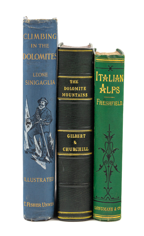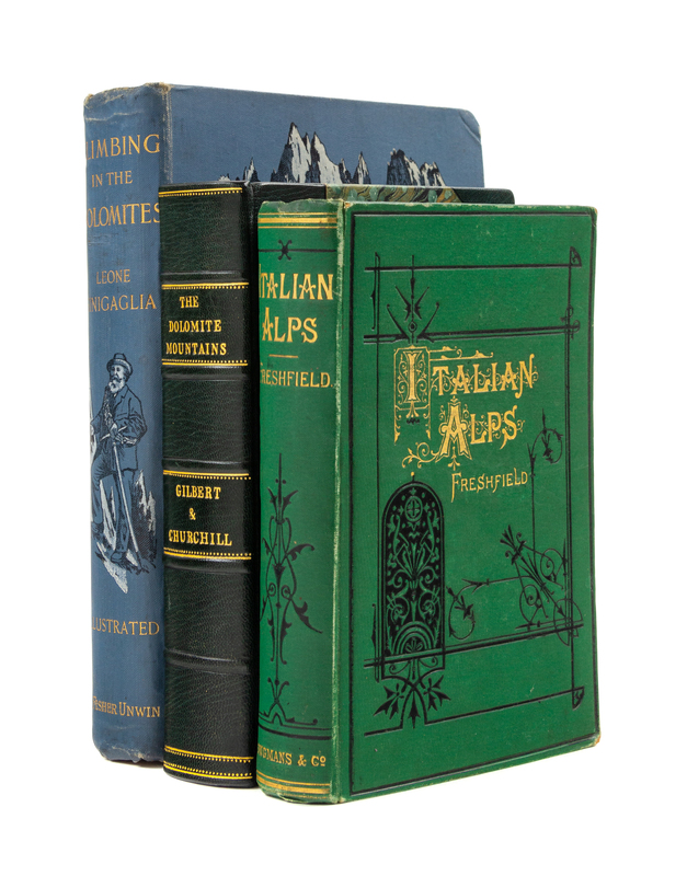 GILBERT, Josiah (1814-1892); CHURCHILL, G.C. The Dolomite Mountains. Excursions through Tyrol, Carinthia, Carniola, & Friuli in 1861, 1862, 1863. London: Longman, Green, et al, 1864. 8vo. 2 folding maps, 6 chromolighographic plates, and numerous wood-engraved plates. (Some light dust-soiling on title and a few leaves.) Modern half green morocco gilt. -- FRESHFIELD, Douglas W. (1845-1934). Italian Alps. Sketches in the Mountains of Ticino, Lombardy, the Trentino, and Venetia. London: Longmans, Green, 1875. 8vo. Engraved title-page, 5 engraved folding maps, 9 wood-engraved plates. -- SINIGAGLIA, Leone (1868-1944). Climbing Reminiscences of the Dolomites. London: T. Fisher Unwin, 1896. 8vo. Photogravure frontispiece, color-printed folding map, and numerous plates. -- All FIRST EDITIONS, all in original publishers bindings except where indicated, condition generally fine.