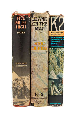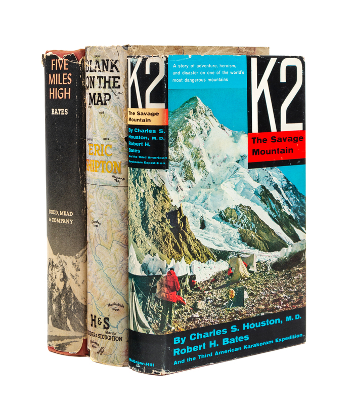 SHIPTON, Eric (1907-1977).Blank on the Map. London: Hodder & Stoughton, 1938. 8vo. 3 maps (1 color folding map), 36 plates. -- BATES, Robert H. (1911-2007); BURDSALL, Richard L. (1895-1953); HOUSTON, Charles S. (1913-2009); et al. Five Miles High. The Story of an Attack on the Second Highest Mountain in the World by the Members of the First American Karakoram Expedition. New York: Dodd, Mead, 1939. 8vo. 3 maps, folding chart, numerous photo plates. -- HOUSTON, Charles S. (1913-2009); BATES, Robert H. (1911-2007). K2. The Savage Mountain. New York: McGraw-Hill, 1954. 8vo. 3 maps, numerous photo plates. SIGNED BY BATES and Dee Molenaar on verso of half-title. -- All FIRST EDITIONS, all in original publishers cloth with original dust jackets, condition generally good.