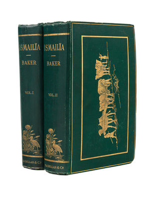 2 volumes, 8vo. With 2 frontispieces, 2 color-printed route maps (1 folding), and 50 wood-engraved plates. Original publisher's green cloth (upper cover to Vol.II slightly bubbling).FIRST EDITION of the third and final of Baker's books on his Nile explorations and journeys, undertaken under contract to the Khedive of Egypt in 1869. Hilmy I, p. 49; Czech (Africa), p 11. A FINE COPY.