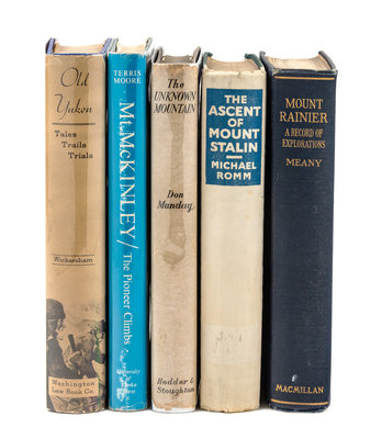 MEANY, Edmond S., editor. Mount Rainier. A Record of Exploration. New York: 1916. -- MOORE, Terris. Mt. McKinley: The Pioneer Climbs. Alaska: 1967. -- MUNDAY, Don. The Unknown Mountain. London: 1948. -- ROMM, Michael. The Ascent of Mount Stalin. London: 1936. -- WICKERSHAM, James. Old Yukon. Tales - Trails - and Trials. Washington: 1938. -- And 7 others. Together, 12 works in 12 volumes, most FIRST EDITIONS, most in original publisher's bindings, condition generally good, complete list available on request.
