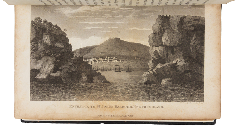 8vo (211 x 128 mm). With engraved frontispiece, hand-colored engraved folding route map, & 2 engraved plates. (Some spotting to a few leaves.) Contemporary black calf gilt (rebacked). FIRST EDITION, recounting the 1813 voyage of the 'Rosamond', which acted as escort to the Hudson Bay Company convoy into St. John's and along Newfoundland to the mouth of the St. Lawrence and on to the southern coast of Labrador. Not in Arctic Bibliography; Sabin 12006; TPL 941.
