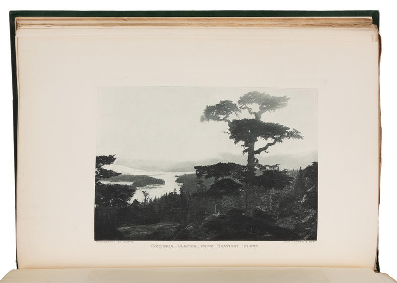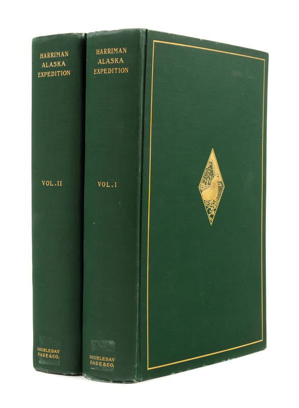 2 volumes (of 12, comprising Vols. I & II), 4to. With half-titles, 5 maps (2 of which are folding route maps on one leaf) & numerous plates (some in color, many photogravures). Original publisher's ribbed green cloth gilt, top edges gilt. Provenance: Ladies Library Association, Port Huron (bookplate). FIRST EDITION describing the expedition planned and financed by Edward H. Harriman as a summer cruise for his family. It was the most elaborate private expedition to Alaska to date, including more than 25 scientists, writers (including John Muir), photographers (including Edward Curtis), artists, and 100 guests. Many of the photogravures are after Curtis. Arctic Bibliography 6676, 6677 (the official reports published by the Smithsonian 1910-1913).