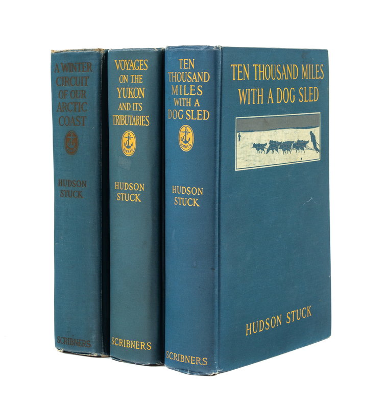 Ten Thousand Miles with a Dog Sled. A Narrative of Winter Travels in Interior Alaska. New York: Charles Scribners, 1914. 8vo. Frontispiece portrait, folding map, numerous photo plates. Publishers blue cloth gilt. FIRST EDITION. -- Voyages on the Yukon and its Tributaries. New York: Charles Scribners, 1917. 8vo. 2 folding maps, numerous plates. Publishers blue cloth gilt. FIRST EDITION. -- A Winter Circuit of Our Arctic Coast. New York: Scribners, 1920. 8vo. Photogravure frontispiece, 2 folding maps, numerous photo plates. Publishers blue cloth gilt (spine lettering slightly faded). FIRST EDITION.