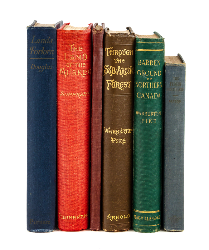 PIKE, Warburton M. (1816-1915). The Barren Ground of Northern Canada. London: Macmillan, 1892. 8vo. 2 color-printed folding maps. (One map neatly repaired at fold.) -- SOMERSET, H. Somers. The Land of the Muskeg. London: William Heinemann, 1895. 8vo. Frontispiece portrait, 4 maps (one folding), numerous half-tones. -- PIKE, Warburton M. (1816-1915). Through the Subarctic Forest. A Record of a Canoe Journey from Fort Wrangel to the Pelly Lakes and down the Yukon River to the Behring Sea. London: Edward Arnold, 1896. 8vo. 2 folding maps, numerous engraved plates. -- PEARY, Robert E. (1856-1920). Nearest the Pole. A Narrative of the Polar Expedition of the Peary Arctic Club in the S.S. Roosevelt 1905-1906. New York: Doubleday, Page, 1907. 8vo. Color frontispiece, 2 color-printed folding route maps, numerous half-tones. -- MASON, Winfield Scott. The Frozen Northland. Life with the Eskimo in his Own Country. Cincinnati: Jennings and Graham, 1910. 8vo. 2 maps, 8 photo plates. -- DOUGLAS, George M. Lands Forlorn. A Story of an Expedition to Hearnes Coppermine River. New York: The Knickerbocker Press for G.P. Putnams, 1914. 8vo. Color frontispiece portrait, 2 color-printed folding maps, numerous half-tones. [Laid in:] Printed calling card of James Douglas, author of the Introduction. -- All FIRST EDITIONS, all in original publishers cloth, condition generally good.