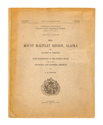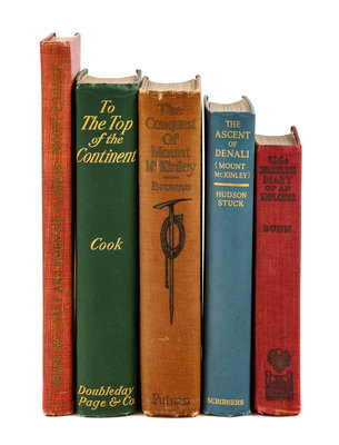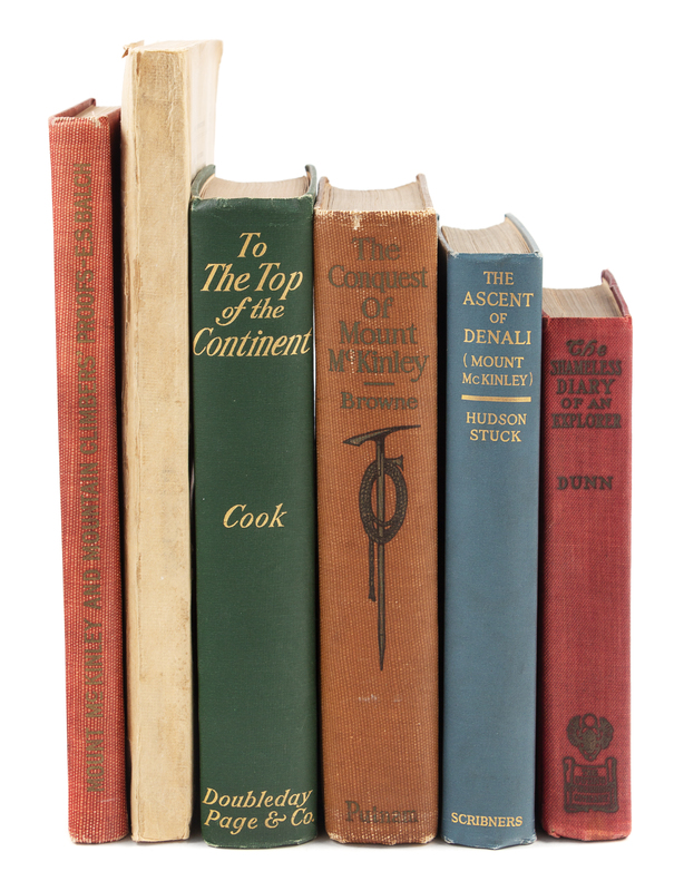 DUNN, Robert (1877-1955). The Shameless Diary of an Explorer. New York: The Outing Publishing Company, 1907. 8vo. 2 folding maps, 11 plates. -- COOK, Frederick Albert (1865-1940). To the Top of the Continent. Discovery, Exploration and Adventure in Sub-arctic Alaska. The First Ascent of Mount McKinley, 1903-1906. New York: Doubleday, Page, 1908. 8vo. Numerous portraits and half-tones. -- BROOKS, Alfred H. (1871-1924). The Mount McKinley Region, Alaska. With descriptions of the igneous rocks and of the Bonnifield and Kantishna Districts by L.M. Prindle. Washington, D.C., Government Printing Office, 1911. Folio. 6 maps (3 large color-printed folding maps in rear cover pocket), numerous photographs and in-text illustrations. Original printed wrappers (repaired and expertly rebacked to match). -- BALCH, Edwin Swift (1856-1927). The North Pole and Bradley Land. Philadelphia: Campion and Co., 1913. 8vo. -- BROWNE, Belmore (1880-1954). The Conquest of Mount McKinley. The Story of Three Expeditions through the Alaskan Wilderness to Mount McKinley, North Americas Highest and Most Inaccessible Mountain. New York: G.P. Putnams by the Knickerbocker Press, 1913. 8vo. Color frontispiece, color-printed folding map, numerous plates. -- STUCK, Hudson (1863-1920). The Ascent of Denali (Mount McKinley). A Narrative of the First Complete Ascent of the Highest Peak in North America. New York: Charles Scribners, 1914. 8vo. Photogravure frontispiece, folding map, numerous photo plates. -- All FIRST EDITIONS, all in original publishers bindings except where indicated, condition generally good.