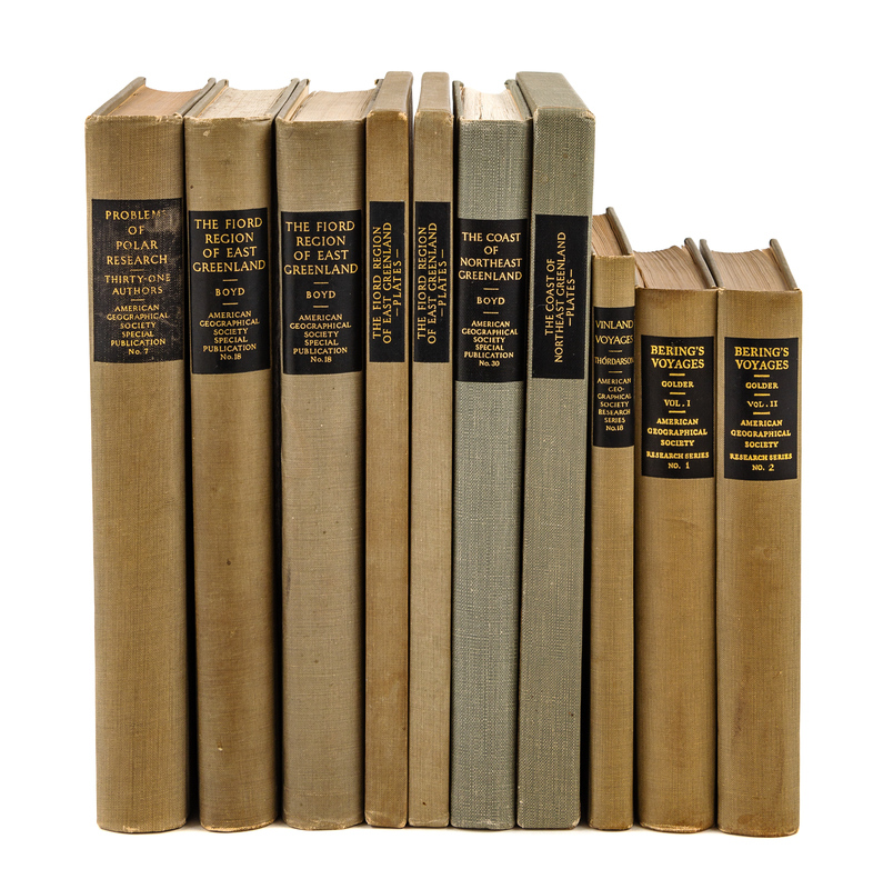 JOERG, W.L.G. (1885-1952), editor. Problems of Polar Research. A Series of Papers by Thirty-One Authors. New York: 1928. 8vo. Color-printed folding map, numerous in-text charts, diagrams, and graphs. -- THORDARSON, Matthias. The Vinland Voyages. With an Introduction by V. Stefansson. New York, 1930. 8vo. Frontispiece, numerous maps and plates. FIRST ENGLISH EDITION. -- [BERING, Vitus J. (1681-1741)]; GOLDER, Frank A. (1877-1929), editor. Bering's Voyages. An Account of the Efforts of the Russians to Determine the Relation of Asia and America. New York, 1935. 2 volumes, 8vo. 4 folding maps and numerous plates. Later reprint. -- BOYD, Louise Arner (1887-1972), et al. The Fiord Region of East Greenland. New York, 1935. 2 volumes (comprising one text volume and one portfolio of plates), 8vo. Frontispiece, numerous plates and maps (including 14 folding maps loose in portfolio as issued). - Another copy. -- BOYD, Louise Arner, et al. The Coast of Northeast Greenland, with Hydrographic Studies of the Greenland Sea. The Louise A. Boyd Arctic Expeditions of 1937, 1938. New York, 1948. 2 volumes (comprising one text volume and one portfolio of plates), 8vo. 12 folding plates and 7 charts in portfolio, numerous half-tones and plates (several loose in portfolio as issued). -- Together, 6 works in 10 volumes, all FIRST EDITIONS, except where indicated, all in original publisher's cloth except where indicated, condition generally good.