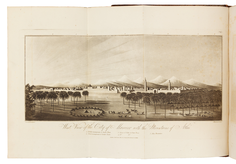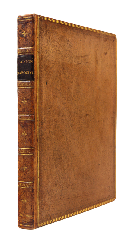 4to (273 x 213 mm). 2 engraved maps (one folding), 11 aquatint plates and panoramic views (2 hand-colored, 5 folding). (Minor offsetting from plates.) Contemporary sprinkled calf gilt (rebacked preserving original spine).FIRST EDITION. Jackson was an English merchant who had lived sixteen years in Morocco, travelled extensively through the country, crossed the southern Atlas Mountains, and joined the caravans to the fabled gold of Timbuktu on the Niger. Although he did not actually reach Timbuktu, he provided an accurate and detailed itinerary of the route to it through the desert, describing the city and its prospects, and the caravan routes from the Niger to Cairo. The most valuable chapter deals with the trade routes for Morocco to the western Sudan. Abbey, Travel 296; Prideaux 242.[With:] JACKSON, James Grey. An Account of Timbuctoo and Housa, territories in the interior of Africa, by El Hage Abd Salam Shabeeny; with Notes, Critical and Explanatory. London: Longman, Hurst, et al, 1820. 8vo (210 x 128 mm). 2 engraved folding maps hand-colored in outline. (Minor offsetting and light browning). Contemporary tree calf gilt (rebacked preserving original spine).