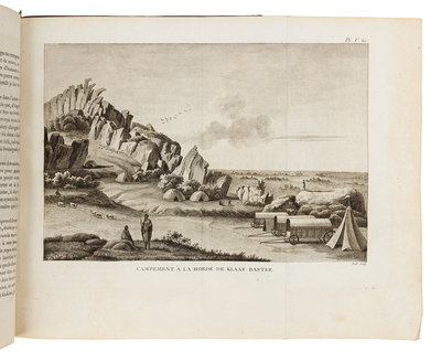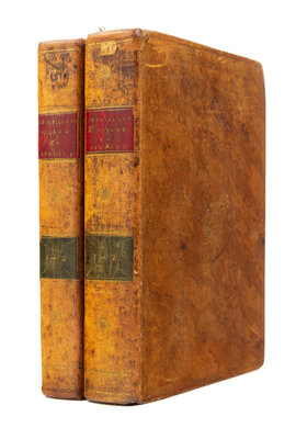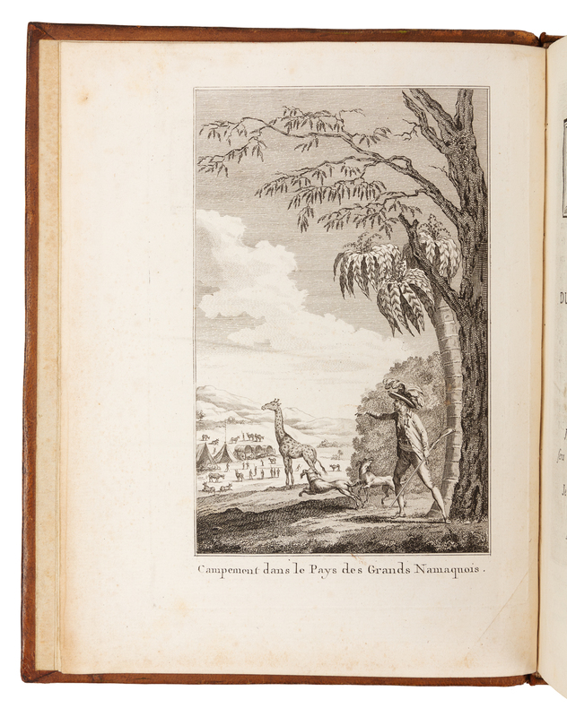2 works in 4 parts in 2 volumes, 4to (245 x 183 mm). First voyage: Engraved folding map, 12 engraved plates; half-title. Second voyage: Half-title. 22 engraved plates (5 folding). (Minor pale spotting and finger soiling, map slightly dampstained at margins.) Contemporary sheep, smooth spines gilt, green and red morocco lettering-pieces gilt. FIRST EDITION of Levaillant's account of his two voyages into the interior of South Africa. "No other account of travel in South Africa has ever attracted the attention of the western world to the same extent... from 1790 to 1814. Le Vaillant's books did more to place the Cape on the world map than did the exploits of any statesman or general" (Bokhorst, Franois Le Vaillant, Traveller in South Africa). With the plate of the "Hottentot" woman facing p. 371 (supressed in later editions). Mendelssohn I:889-892; Nissen ZBI 2480, 2482.