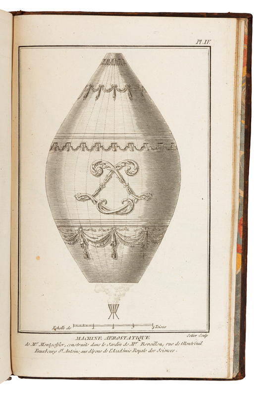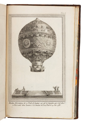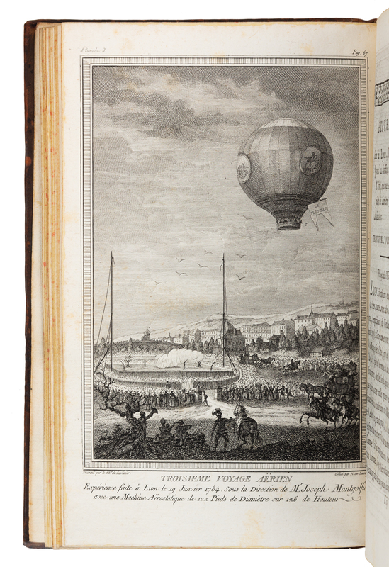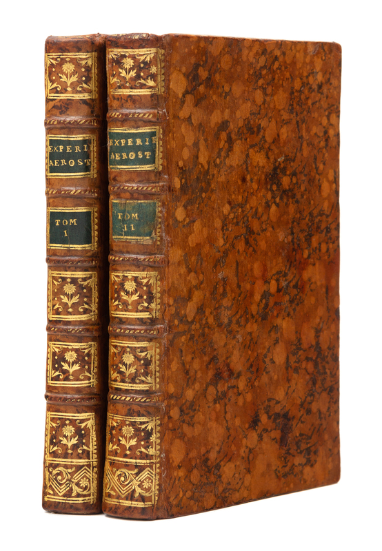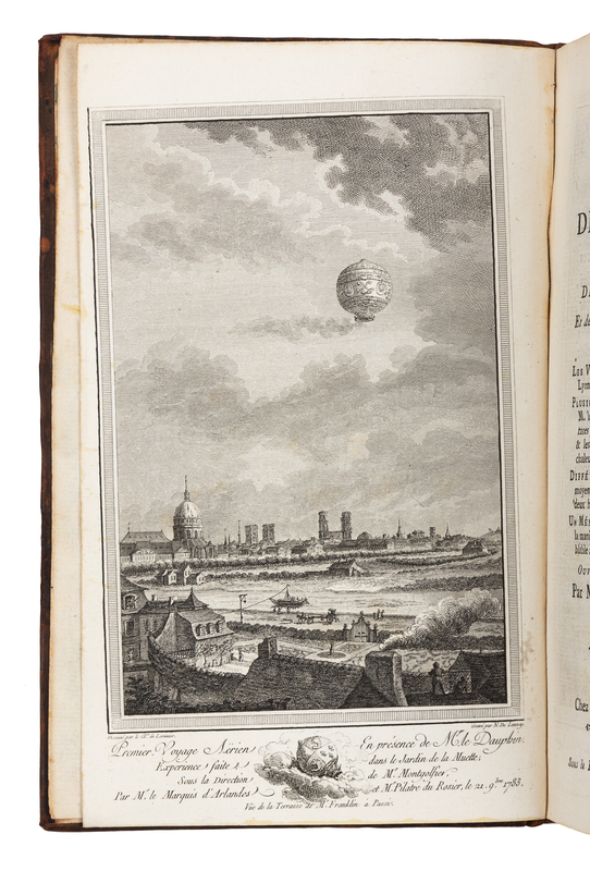 2 volumes, 8vo (194 x 122 mm). 2 engraved frontispieces, 12 engraved plates. Contemporary French mottled calf gilt, green calf lettering-pieces gilt; half blue morocco folding case. Provenance: Tesson (armorial bookplate). FIRST EDITION, second issue, with the four-page supplement. "THE FIRST SERIOUS TREATISE ON AEROSTATION AS A PRACTICAL POSSIBILITY" (PMM). The year 1783 marks the beginning of the history of flight, and the present work offers THE FIRST CONTEMPORARY CHRONICLE OF THE FIRST AERIAL VOYAGE. In June of 1783, the Montgolfier brothers successfully launched a balloon over Annonay. This feat was surpassed in September when they sent up another balloon, but this time it was carrying a sheep, a cock and a duck. Even more sensational was the flight of November 21, in which Pilatre de Rozier, accompanied by the Marquis d'Arlandes, made the first aerial voyage in history. This famous flight began at the Chateau de la Muette in the Bois de Bologne, and lasted for twenty-five minutes, during which time they flew for five and a half miles across Paris and landed safely in the outskirts of the city. The experiment, which was witnessed by the Dauphin and Benjamin Franklin, was an event of the highest importance. The second volume describes the two-hour flight made by J. A. C. Charles in a hydrogen balloon of his own invention on December 1, 1783. It also contains descriptions of other flights in 1784 by Gerli & Andreani, J. de Montgolfier, Blanchard, and Morveau & Bertrand. The main features of modern balloon technology can be directly attributed to the design of this eminent scientist. All of these events are described in detail in these volumes. A SUPERB SET. Brockett 4376, 4378; Dibner Heralds of Science 179; PMM 229; Norman 769; Sparrow Milestones of Science 179; Tissandier 21.