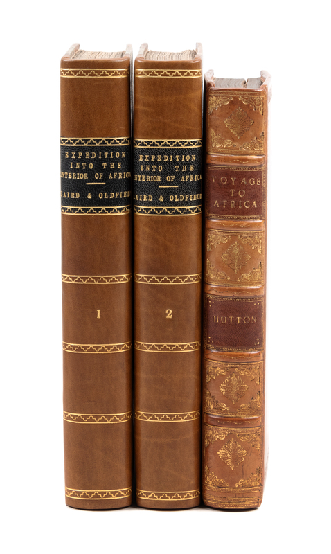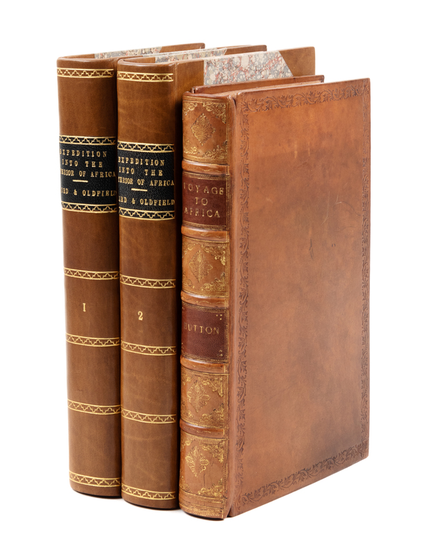 [With:]HUTTON, William. A Voyage to Africa: including a Narrative of an Embassy to One of the Interior Kingdoms, in the year 1820 London: Longman, Hurst, et al. 1821. 8vo. 2 folding engraved maps and 4 hand-colored engraved plates. Modern full tan calf. FIRST EDITION.
